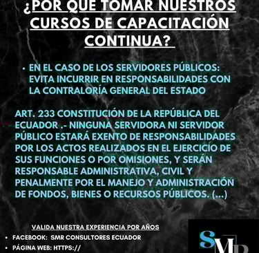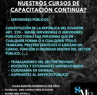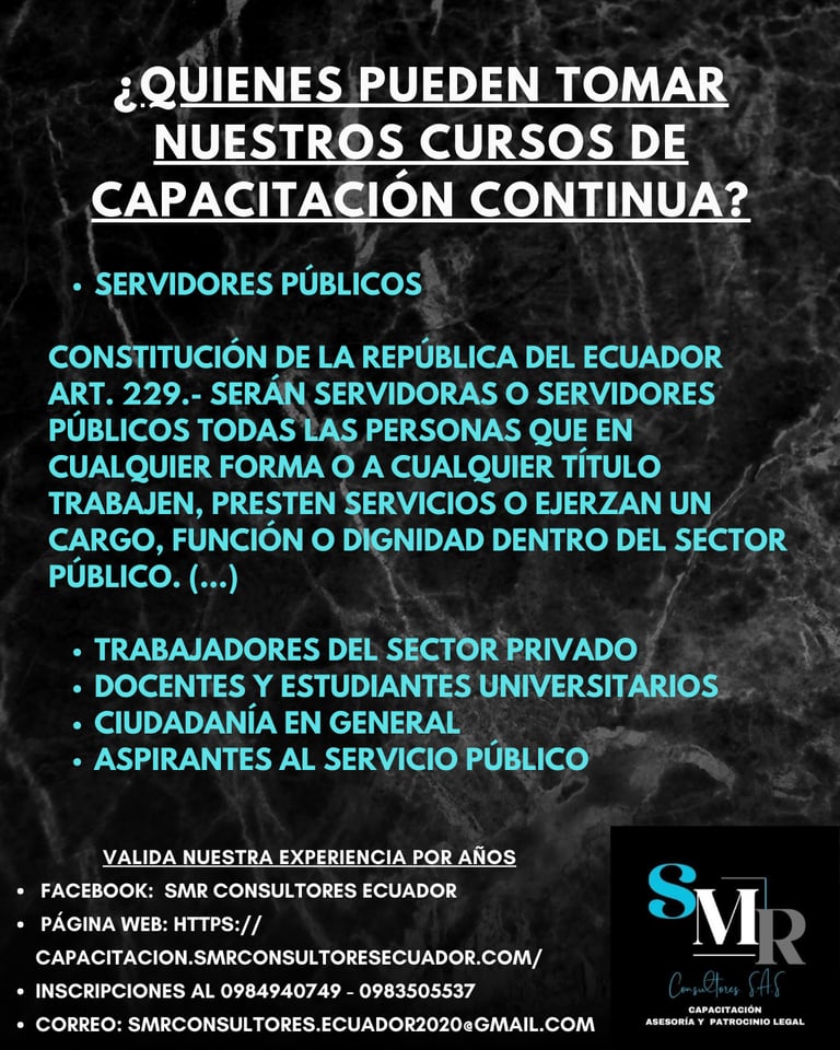 VALIDA NUESTRA EXPERIENCIA POR MÁS DE 6 AÑOS CAPACITANDO ONLINE A NIVEL NACIONAL E INTERNACIONAL, Y VISITA NUESTRA PÁGINA DE FACEBOOK SMR CONSULTORES ECUADOR 👏💯📈.